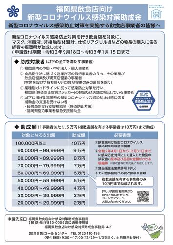 飯塚市は、8月3日から新型コロナウイルス感染症の感染拡大防止策に関する取組をしている市内事業者の事業継続を応援することを目的として、感染拡大防止策の取り組みに要した費用に対し応援金の支給を行う、飯塚市独自の支援事業を始めました。※11月13日(金…